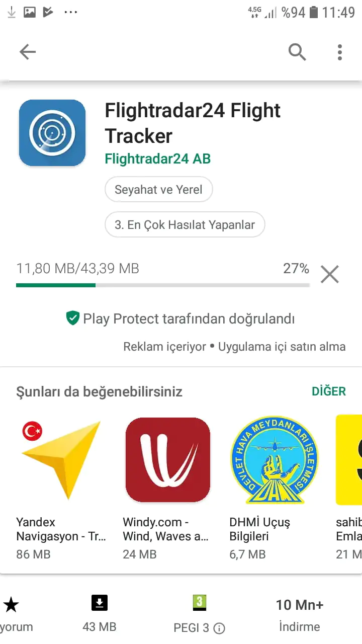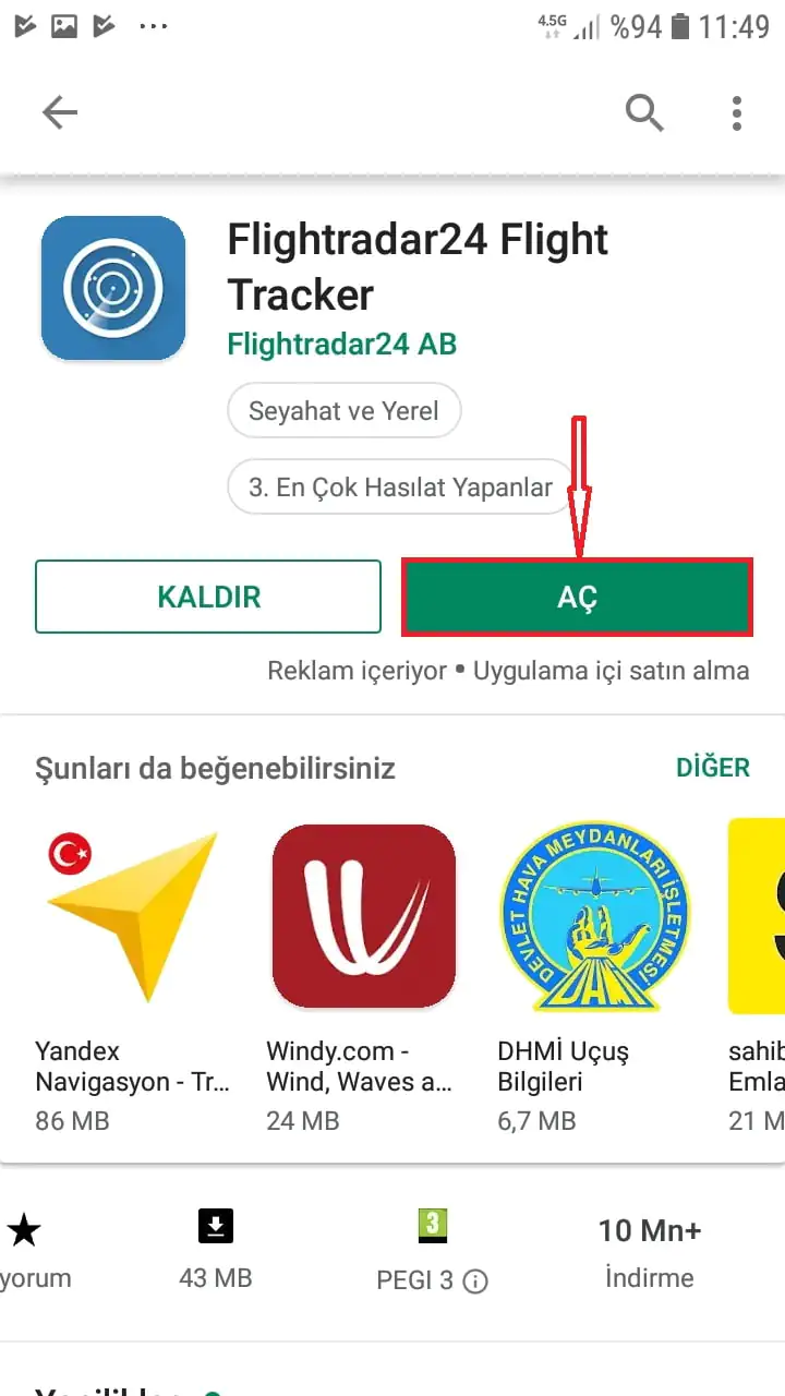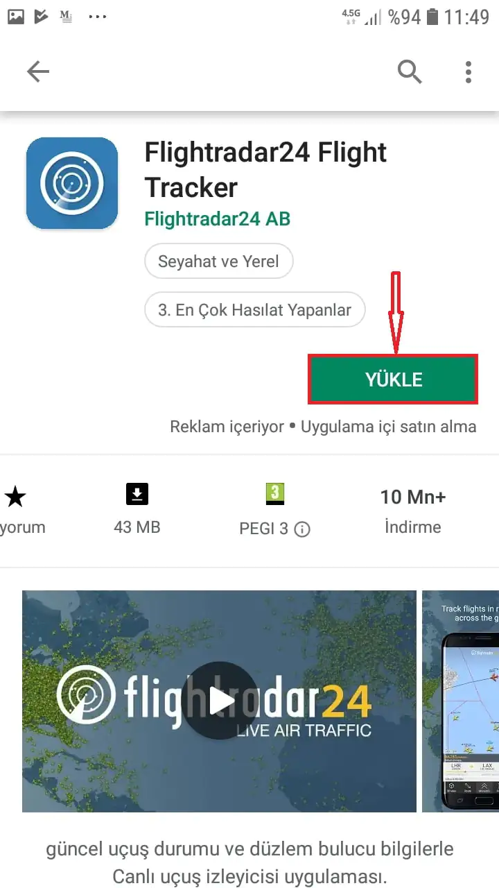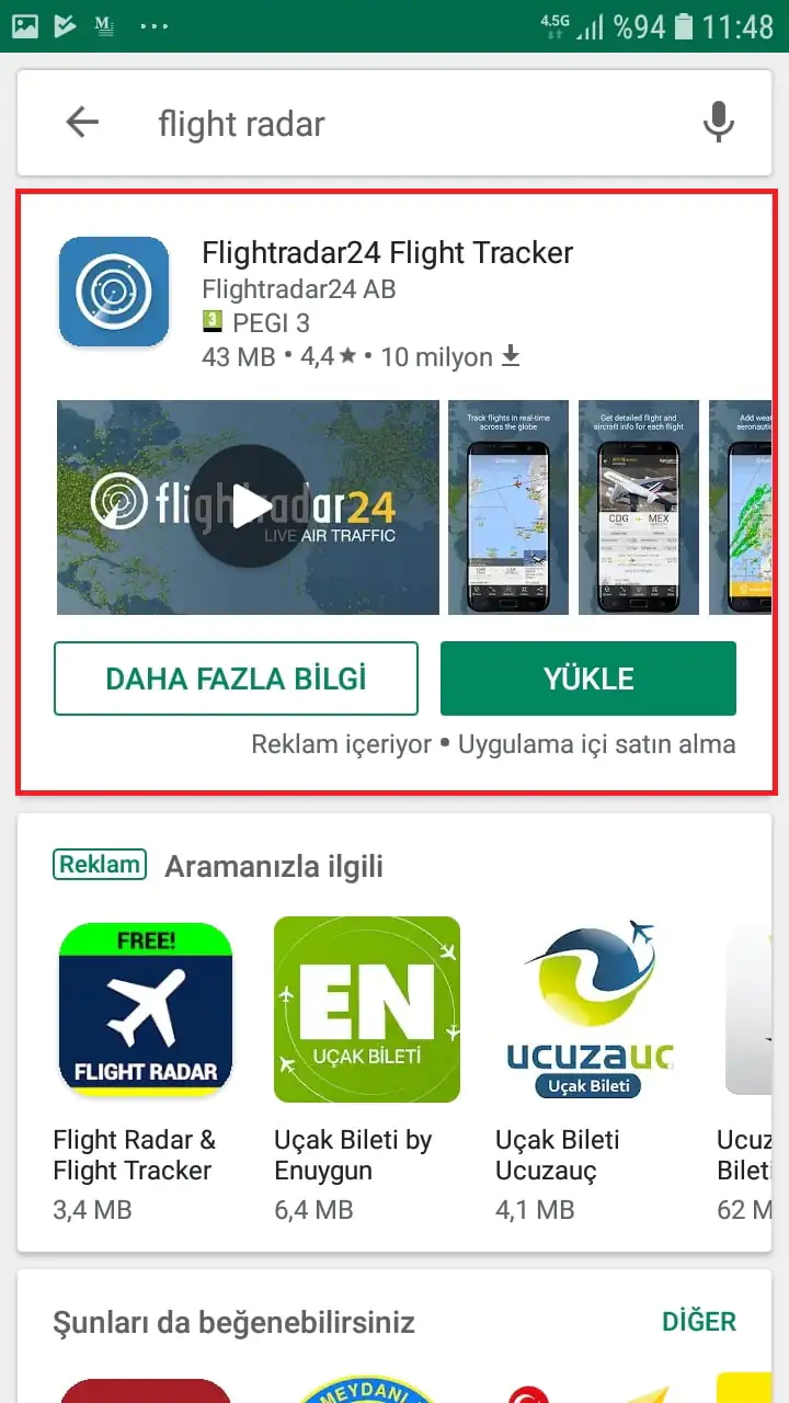 • Çıkan arama sonuçlarından ‘Flightradar24 Flight Tracker’ uygulamasını seçiyoruz.