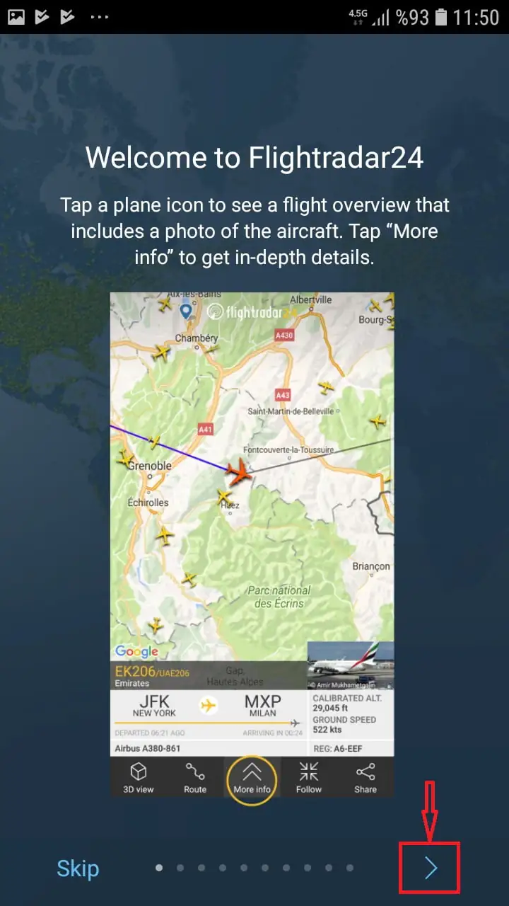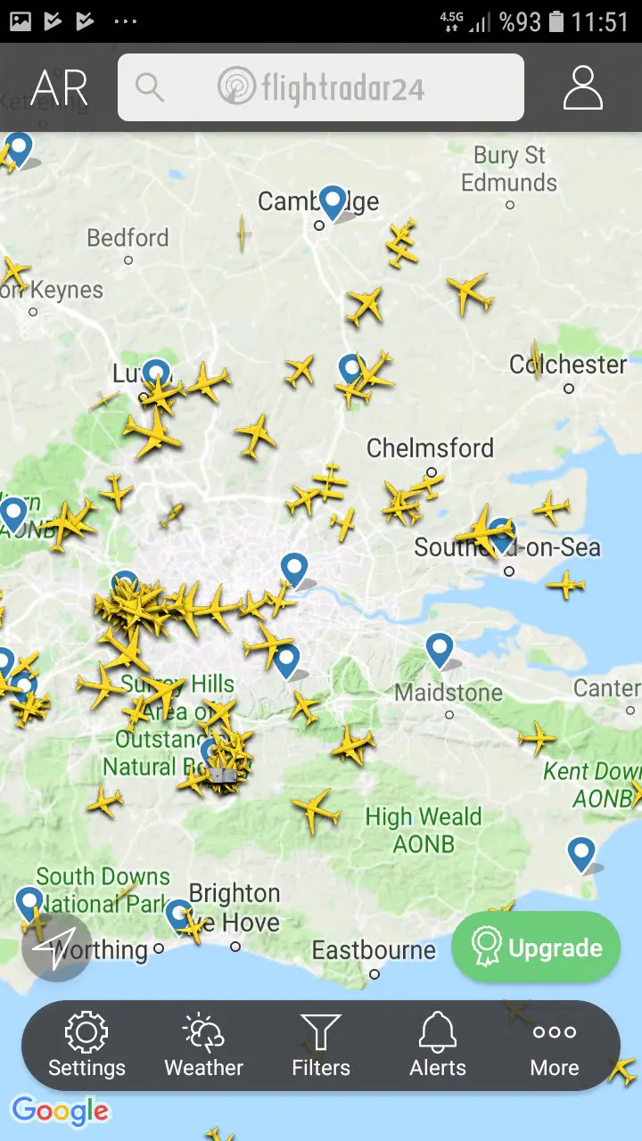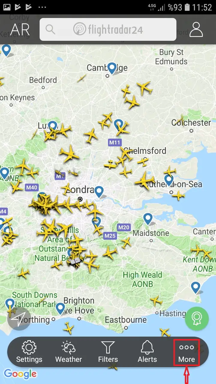 • Google Maps (Google Haritalar) benzeri bir sayfada rastgele koordinatlara ait bir konum gelecek ekrana. Haritada, o anda o konum üzerinde seyahat eden (uçan) uçaklara ait uçak simgeleri görünecek. Harita anlık olarak bu seferleri ve trafiği gösterdiğinden, uçakların hareket ettiğini göreceksiniz.