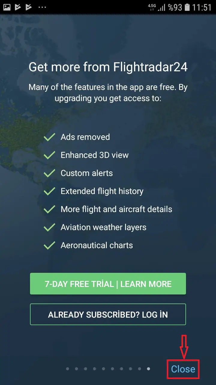 • Son sayfada, uygulamanın reklamsız Pro sürümü özellikleri ile ilgili bilgi sunulacak. Pro sürümünü, 7-gün ücretsiz deneyebilirsiniz isterseniz. Denemek istemiyorsanız, ‘Close’ linkine (bağlantısına) tıklayıp devam edebilirsiniz.
