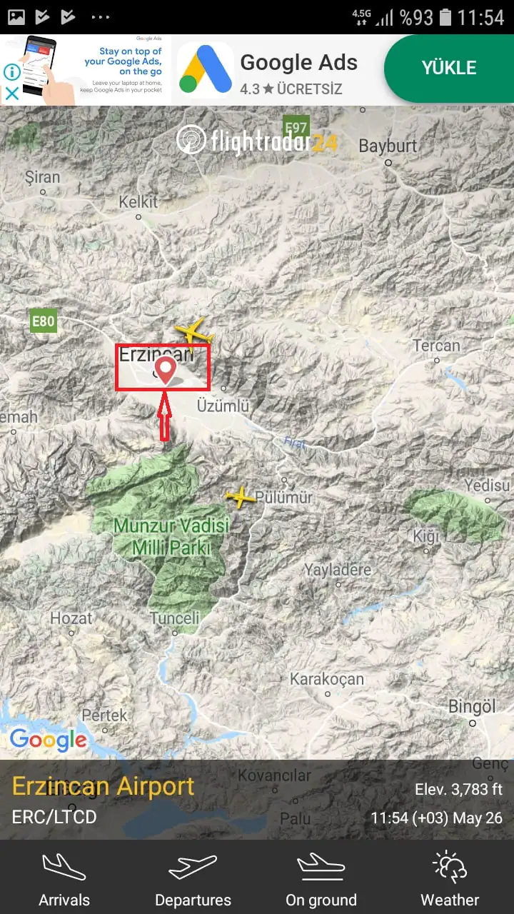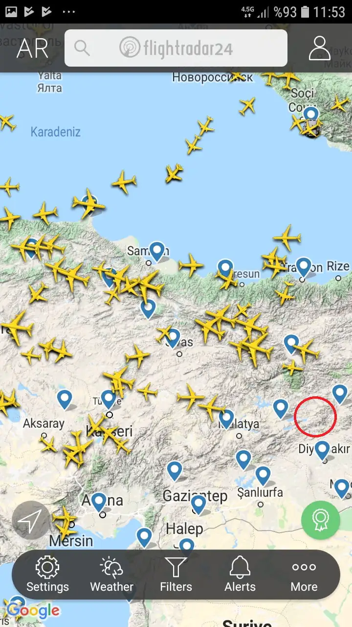 • Mavi-beyaz renkli pin işareti ile gösterilen koordinatlar ise havaalanları.