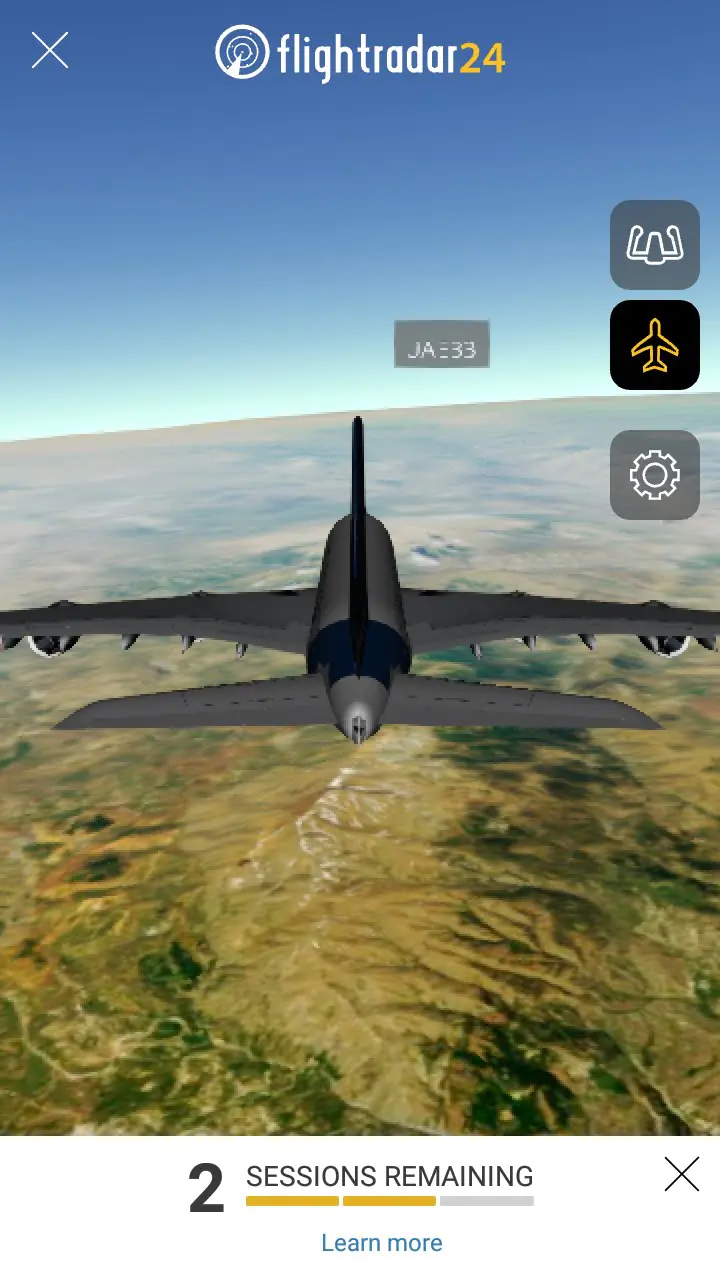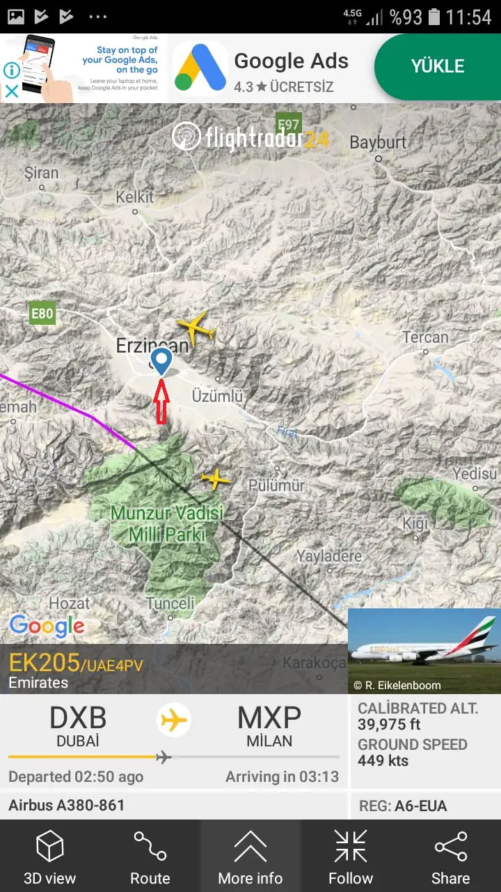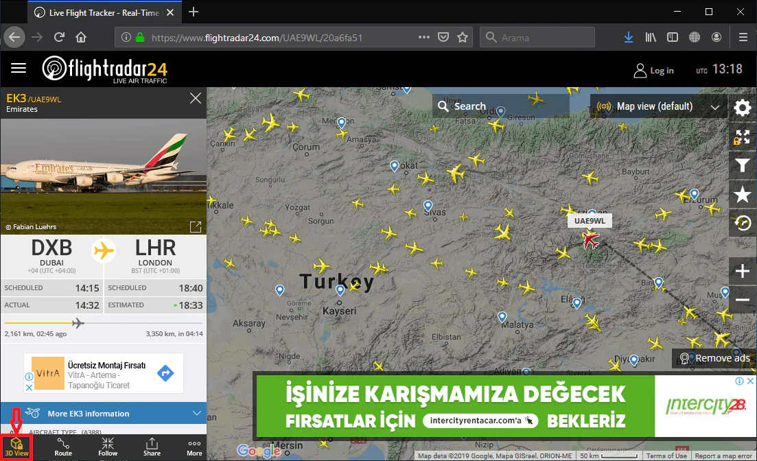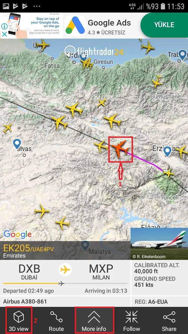 • Harita üzerinde uçak simgesi ile gösterilen herhangi bir sefere (uçuşa) ait bilgileri görüntülemek için, uçak simgesine dokunun. Uçak simgesinin rengi sarıdan kırmızıya dönecektir. O sefere (uçuşa) ait bilgileri, ekranın alt kısmında sekmeler (menüler) şeklinde sunulan panelde görüntüleyebilirsiniz. Örneğin ‘3D view’ menüsüne (sekmesine) dokunarak, o sefere ait uçağın 3-boyutlu hareket (uçuş) simülasyonunu görüntüleyebilirsiniz.