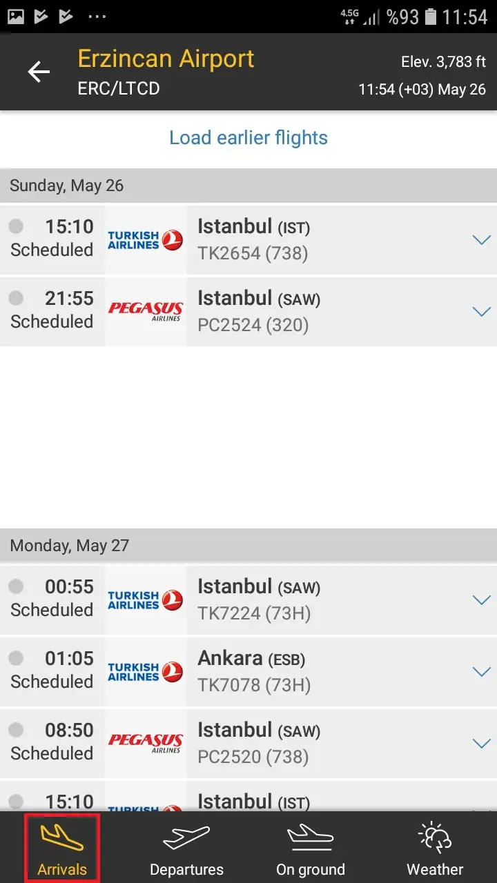 • Ekranın alt kısmındaki panelde bulunan menülerden (sekmelerden) ‘Arrivals’ menüsüne (sekmesine) dokunduğunuzda, o havaalanına yapılan (gelen) seferleri ve sefer saatlerini görüntüleyebilirsiniz.
