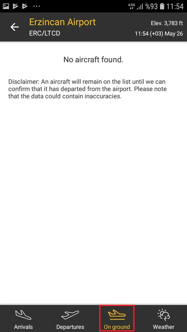 • ‘On ground’ menüsüne dokunarak, bulunduğunuz an itibari ile o havaalanında kalkış için bekleyen seferleri (uçakları) ve sefer saatlerini görüntüleyebilirsiniz.