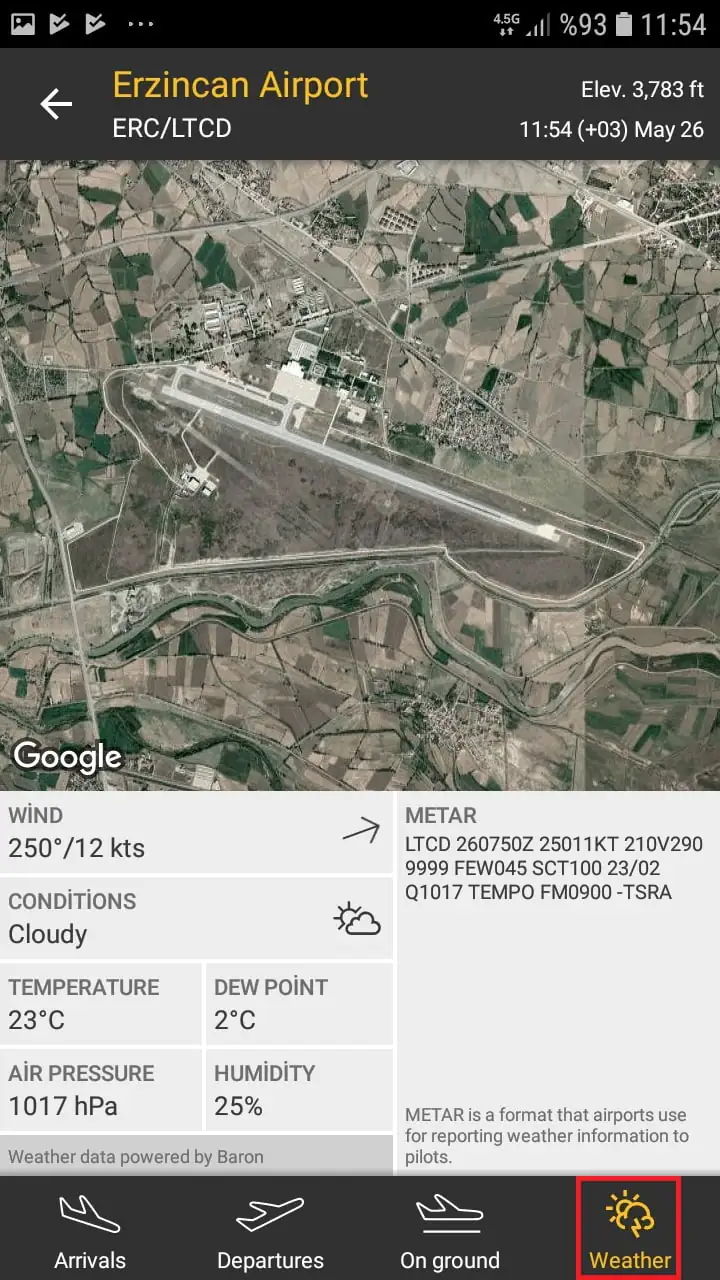 • ‘Weather’ menüsüne (sekmesine) dokunarak, bulunduğunuz an itibari ile o havaalanına ait hava durumu bilgilerini ve istatistiklerini (hava durumu sıcaklık, basınç, rüzgar hızı, vb) görüntüleyebilirsiniz.