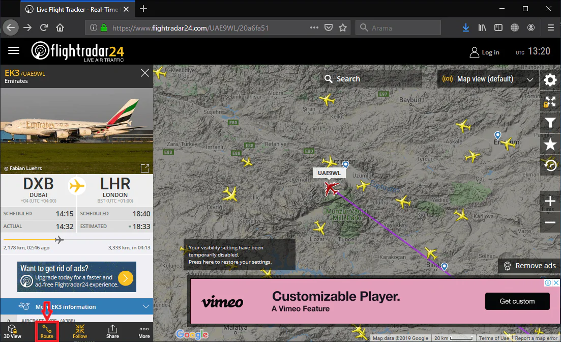 • ‘Route’ menüsüne (sekmesine) tıklayarak, uçağın (seferin) rotasını (güzergahını) görüntüleyebilirsiniz.
