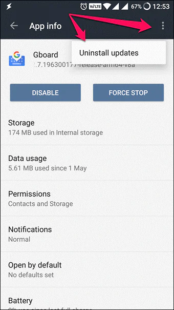 Ayarlar’a gidin ve Uygulamalar’a tıklayın. Bir kez daha, Gboard’u bulun ve seçin. Güncelleştirmeleri kaldır seçeneğini görmek için ekranın sağ üstündeki üç dikey noktaya tıklayın.