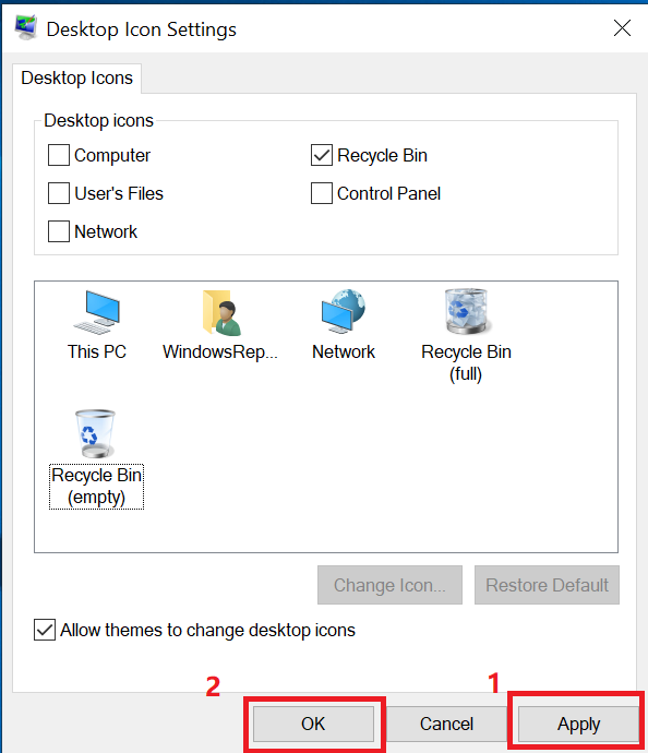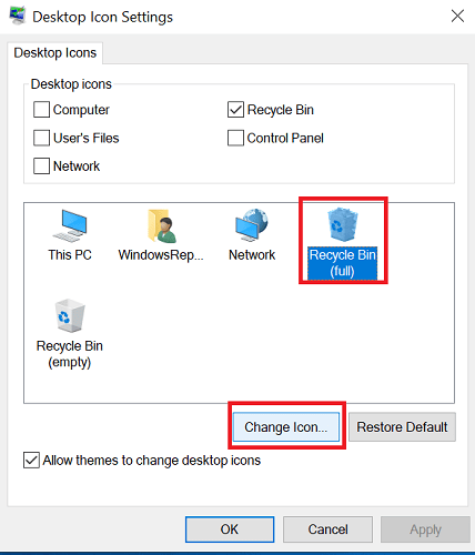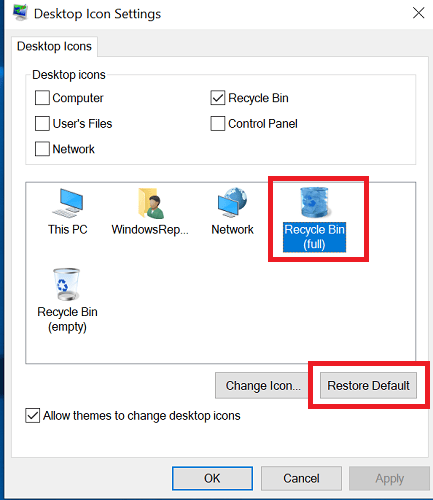 5. Geri Dönüşüm Kutusu simgeleriniz artık varsayılan Windows 10 ayarlarına geri ayarlanmalıdır