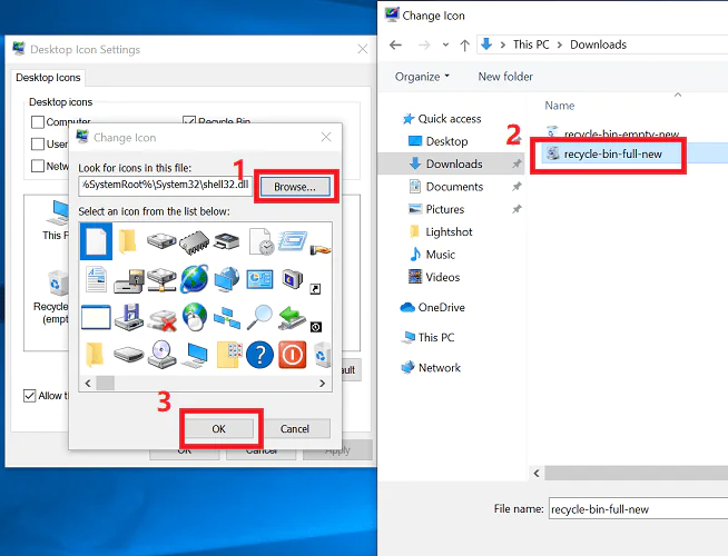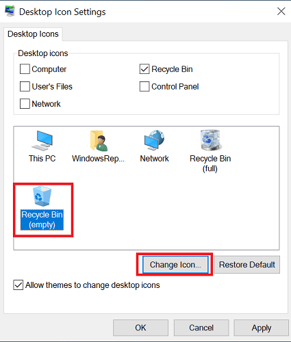 7. Geri Dönüşüm Kutusu (boş) simgesini seçerek aynı adımları tekrarlayın, ardından Simgeyi değiştir’i seçin.