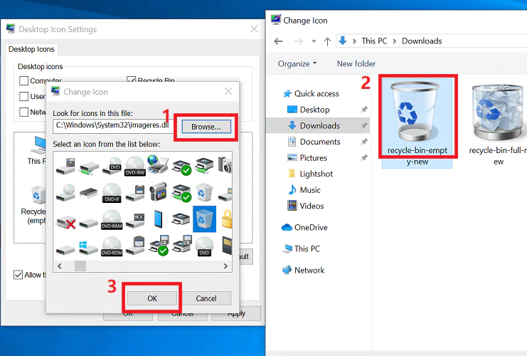 • Geri Dönüşüm Kutusu simgeleriniz artık seçtiğiniz görüntülerle değiştirilmelidir