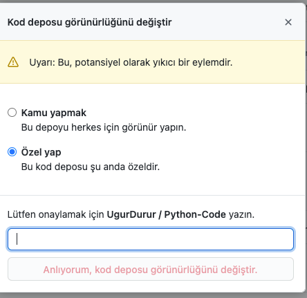 Açılan yeni pencerede kod deposu görünürlüğü değiştir kısmına tıklıyoruz