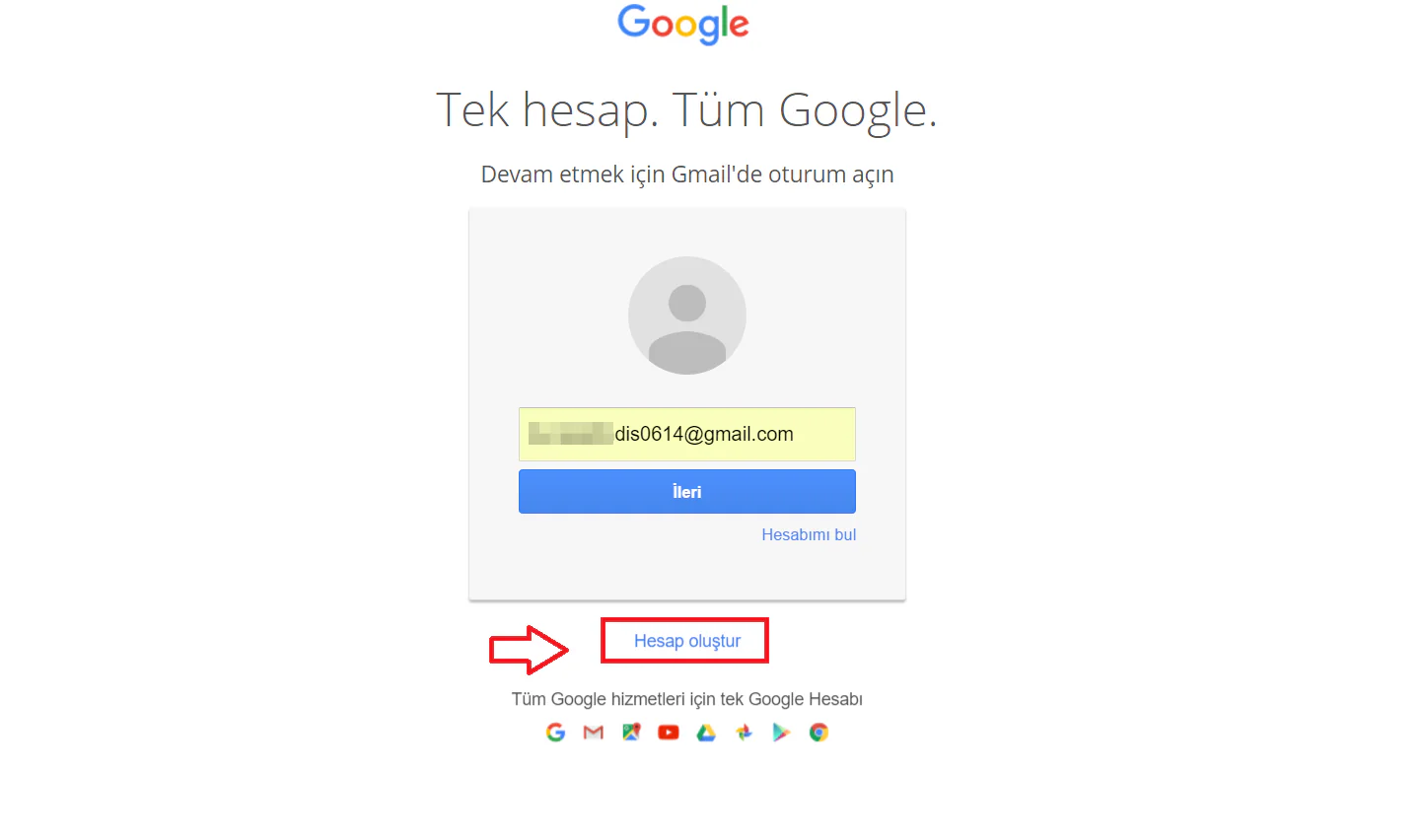 Açılan sayfada alt kısımda “Hesap Oluştur” linkine tıklayalım; aşağıdaki resimde görüldüğü gibi.