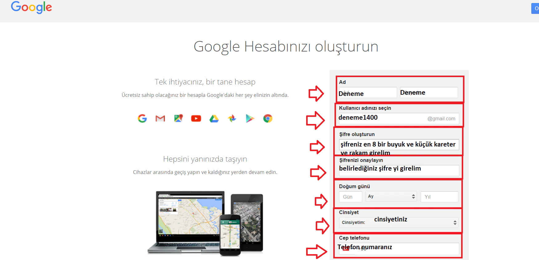 Karşınıza, “Google Hesabınızı oluşturun” başlıklı bir sayfa çıkacaktır ve hesap oluşturmak için gerekli kişisel bilgilerinizi doldurmanızı isteyecektir. Ve şifreniz de en az 8 karakterden oluşmalı ve en az 1 büyük harf, 1 küçük harf ve 1 rakam içermelidir.