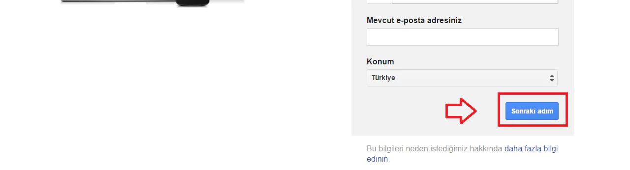 Kullanıcı adınız, Gmail adresiniz olacağı için doğru ve kullanmak istediğiniz bir kullanıcı adı girmeniz gerekmektedir. Bilgileri doğru bir şekilde girdiyseniz, “Sonraki adım” butonuna tıklayınız; aşağıdaki resimde görüldüğü gibi.