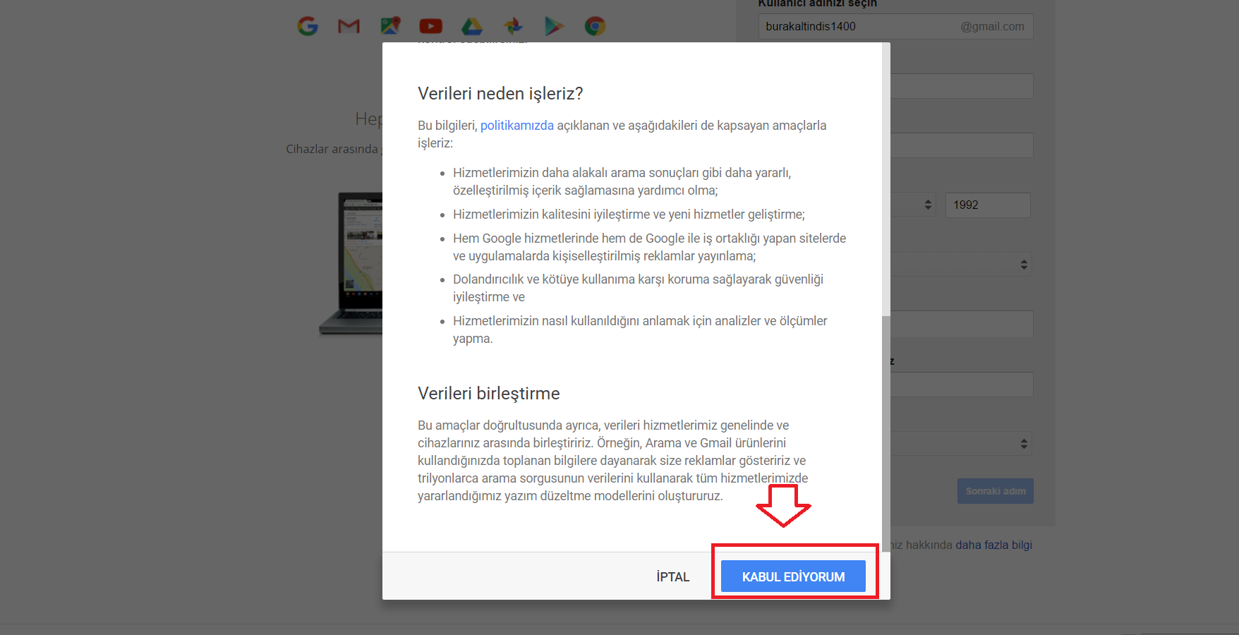 Kullanım sözleşmesi penceresi gelecektir. Sözleşmeyi okuyup “KABUL EDİYORUM” butonuna tıkladıktan sonra Gmail hesabınız oluşturulacaktır.