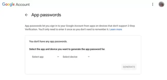 İki faktörlü kimlik doğrulamayı (2FA) etkinleştirmek , Gmail hesabınızı güvende tutar. Ancak, 2FA işlemi tarafından oluşturulan doğrulama kodları, bazı uygulamalar ve cihazlarla çalışmaz. Böyle bir durumda, uygulamaya veya cihaza IMAP (veya POP aracılığıyla posta) aracılığıyla posta ve klasörlere erişme yetkisi vermek üzere uygulamaya özel bir parola oluşturun . Uygulamayı veya cihazı artık kullanmadığınızda veya parolanın güvenliğini sağlama konusunda artık ona güvenmediğinizde, parolayı iptal edin. Uygulamaya özel bir şifreyi iptal etmek, farklı uygulamalar veya cihazlar için oluşturduğunuz diğer şifreleri etkilemez.