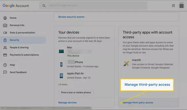 2FA veya uygulamaya özel şifreler kullanmasanız bile Gmail’inize (ve diğer Google hizmetlerine) erişimi olan üçüncü taraf uygulamalarını yönetmek için :