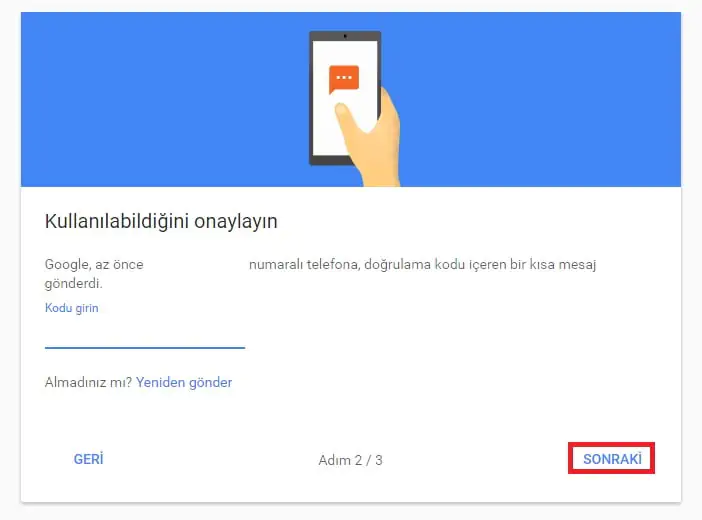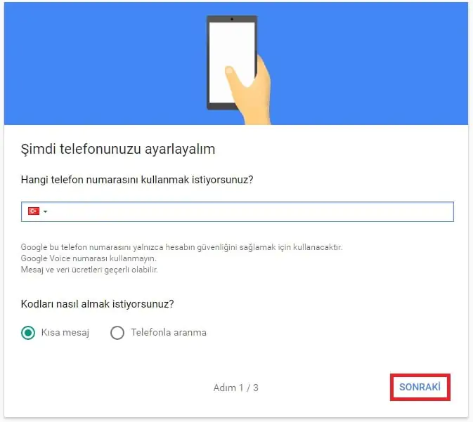 ‘2 Adımlı Doğrulama’ sistemi Gmail hesabınızda aktifleştiğinde, hesabınızla ilgili bir çok işlemi gerçekleştirirken sizlere gönderilen ek onay şifrelerine ihtiyacınız olacaktır. Gmail onay kodları, cep telefonunuza SMS olarak gönderilecektir. Telefon numaranızı değiştirmeniz veya telefonunuza erişimemeniz durumlarını da düşünerek, ikinci bir telefon numarası girmeniz faydanıza olacaktır.