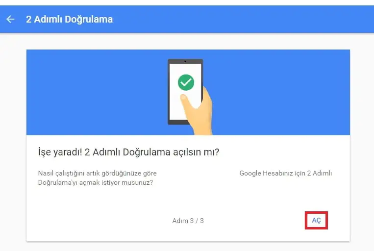 Gerekli seçimlerimizin ardından ekranda, sağ altta bulunan “Aç” butonuna tıklayarak “2 Adımlı Doğrulamayı” etkinleştiriyoruz.