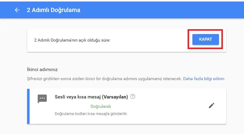 “2 Adımlı Doğrulama” özelliğini kapatmak istediğimizde, bir sonraki ekranda ve Google hesabımızın ana ekranında bulunan “2 Adımlı Doğrulama” seçeneklerindeki “Kapat” butonuna tıklayarak “2 Adımlı Doğrulama” özelliğini deaktif edebiliyoruz.