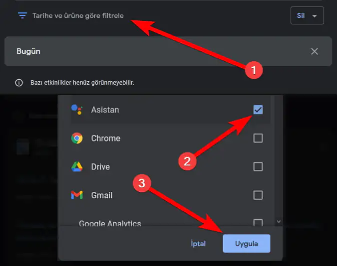 “Tarihe ve ürüne göre filtrele”ye tıklayın ve açılan menüden “Asistan”ı seçin.