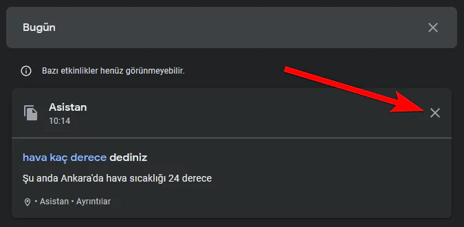 Çıkan liste sadece Google Asistan verilerini barındırıyor olmalıdır. Veriler tarihe göre sıralanmıştır ve istediğiniz verileri yanında bulunan “X” ikonuna tıklayarak silebilirsiniz.