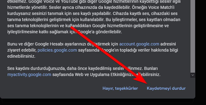 Ses kayıtlarını kapatırsanız nelerin değişeceğini anlatan bir metin kutusu sizi karşılayacak. Okuduysanız ve eminseniz “Kaydetmeyi durdur” diyerek devam edin.