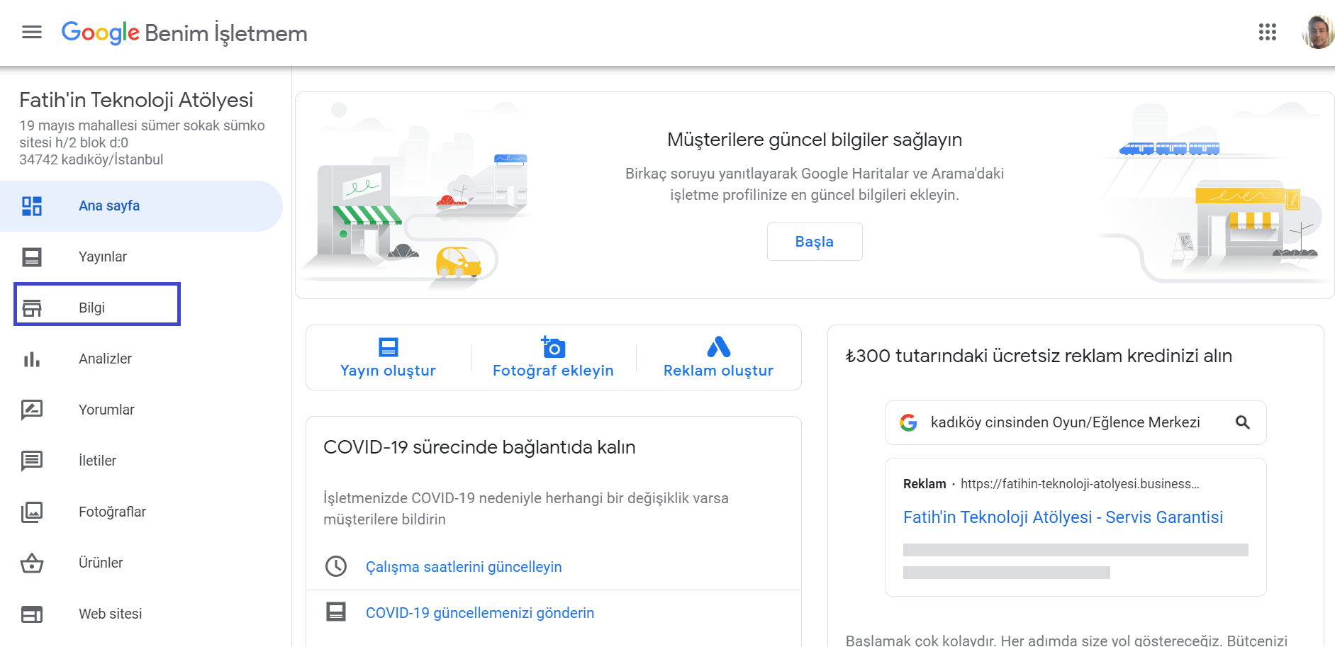 a) İlgili profil bilgilerinizle giriş yaptıktan sonra İşletme Profili yönetim konsolu ekranımızda bulunan ‘Bilgi‘ sekmesine tıklayalım.