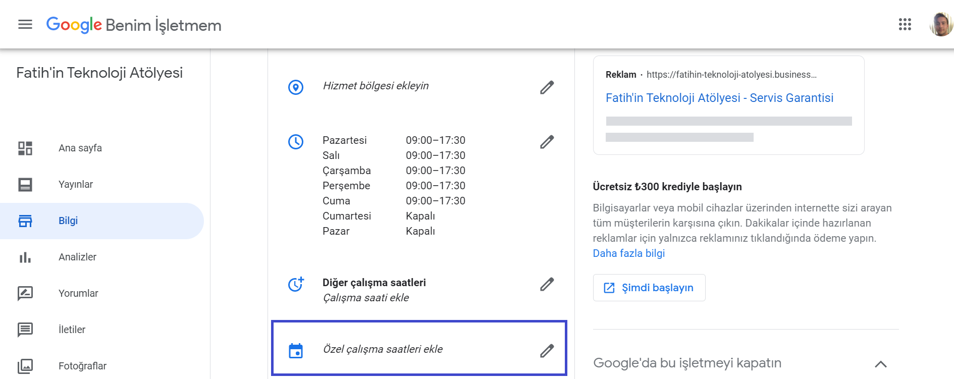 b) Bilgi Menüsünde bulunan çalışma saatleri kısmının altında bulunan ‘Özel Çalışma Saatleri Ekle’ kısmına tıklayalım.