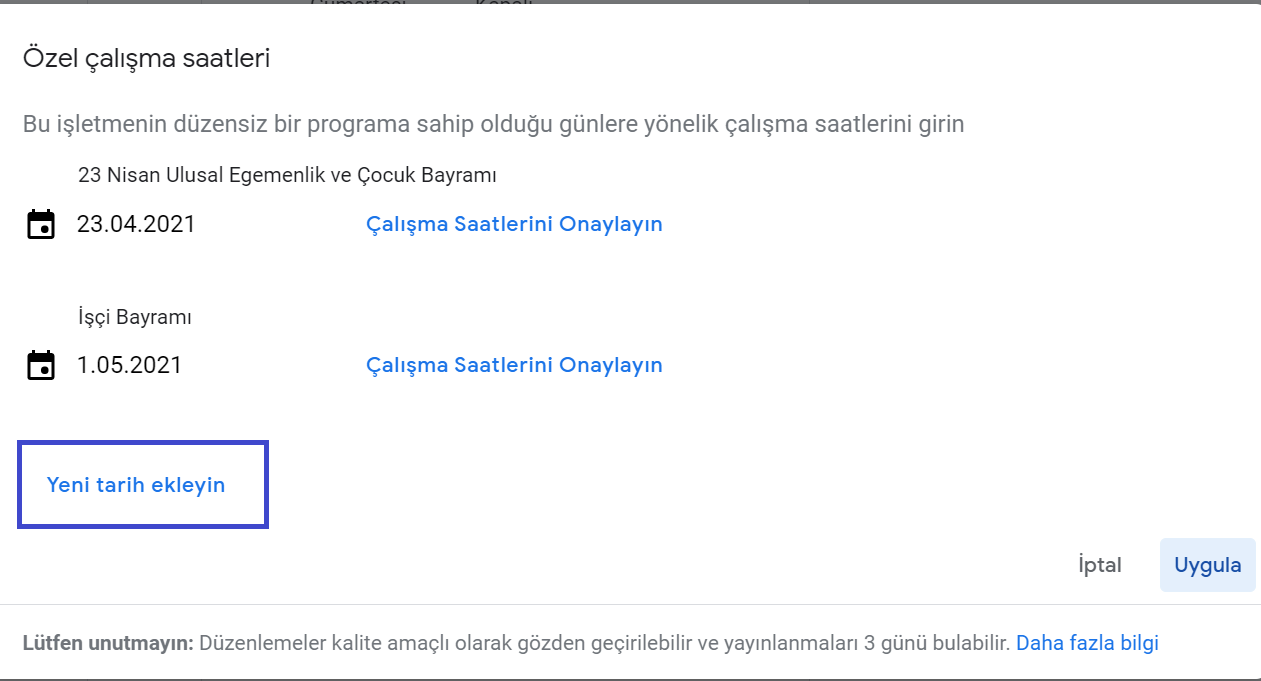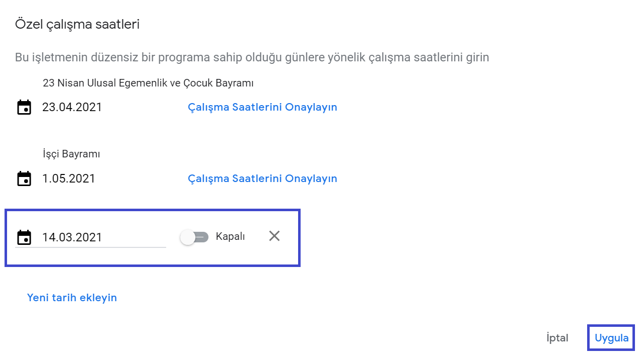 İşletmeniz eğer birden fazla gün kapalı kalacaksa kapalı olacak tarihleri tek tek seçerek işlem adımlarını uygulamanız gerekiyor , işlem adımlarından sonra ‘Uygula’ diyerek işletmenizin çalışma saatlerini düzenleyebilirsiniz , ayrıca işlem yaptıktan sonra her ihtimale karşı ‘Google‘da işletme profilinizi aratarak durumu kontrol etmenizi öneririz .