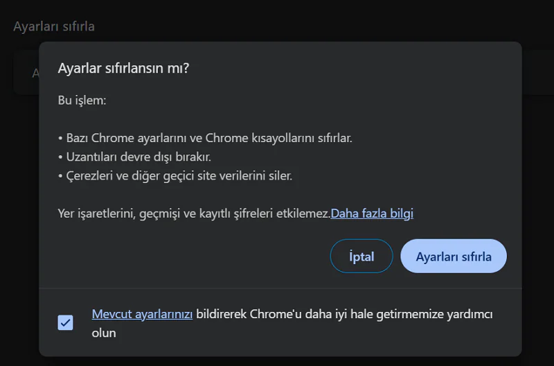 Endişelenmeyin, yer işaretleriniz ve kayıtlı şifreleriniz bu işlemden etkilenmez. Sadece tüm eklentiler devre dışı kalır, geçici veriler, çerezler ve önbellek temizlenir. Çoğu durumda bu işlem sonrasında ERR_FILE_NOT_FOUND hatası ortadan kalkar.