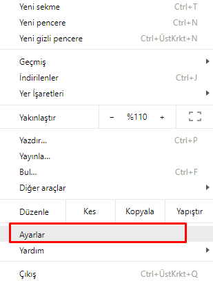 - Açılan menü listesinde Ayarlar menüsüne tıklıyoruz.
