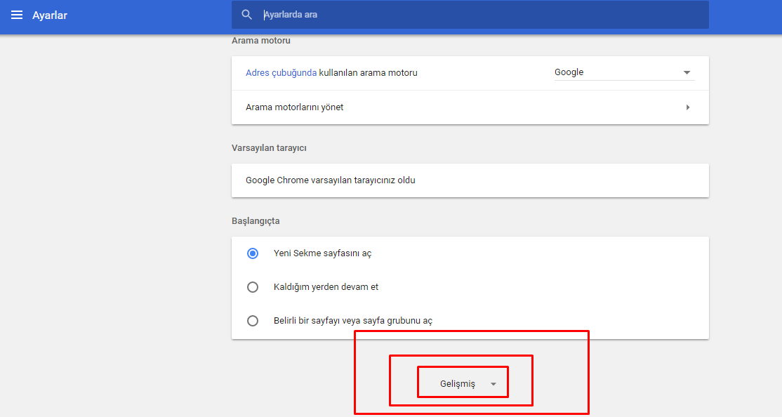 - Açılan sayfada Gelişmiş menüsüne tıklayıp alt menüleri açıyoruz.