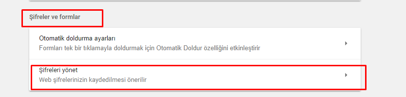 - Açılan alt menülerde Şifreler ve formlar başlığı altındaki Şifreleri yönet menüsüne tıklıyoruz.