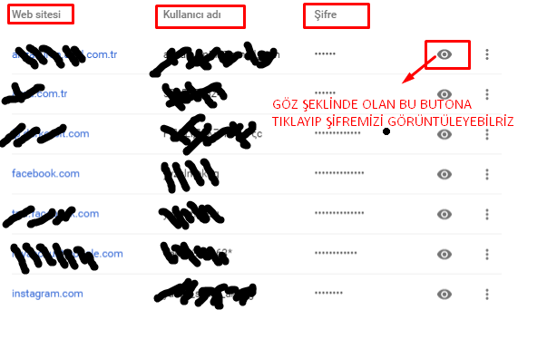 - Açılan sayfada, hangi web sitesindeki hesabınızın şifresini öğrenmek/görmek istiyorsanız, o site isminin karşısındkai göz simgesine tıklamamız durumunda, o hesabınıza ait şifreyi görüntüleyebilirsiniz.