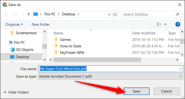 PDF dosyasını nereye kaydedeceğinizi seçmenizi isteyen bir pencere açılacaktır; isterseniz şu anda dosya adını bile değiştirebilirsiniz. Kaydetmek istediğiniz klasöre gidin ve ardından “Kaydet” düğmesine tıklayın.