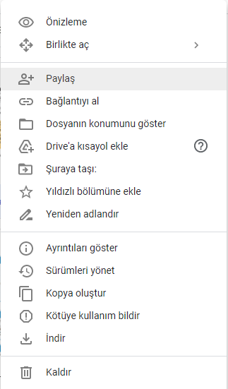 - Öğenin içerik menusünde Paylaş’a tıklayın.