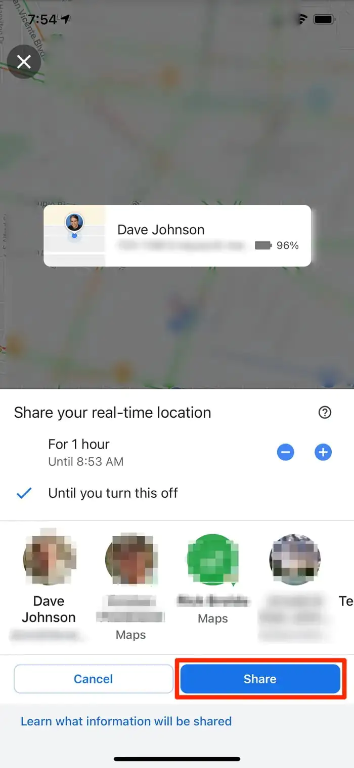 - Konumunuzu paylaşmak istediğiniz kişiyi seçin ve ardından, ne kadar süreyle veya konum paylaşımını manuel olarak kapatana kadar paylaşacağınızı seçin.