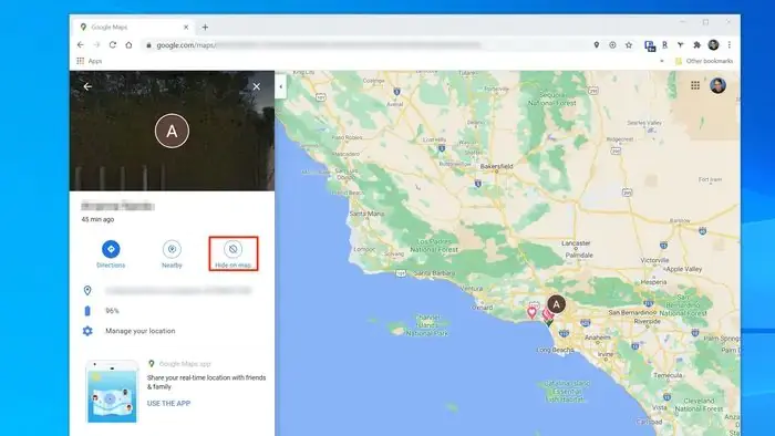 Bu işlemi bilgisayarda yapmak için Konum paylaşımı (Location sharing) menüsünü açın; ve konum takibini iptal etmek istediğiniz kişiye tıklayın; ve ardından Haritada gizle (Hide on map) seçeneğine tıklayın.
