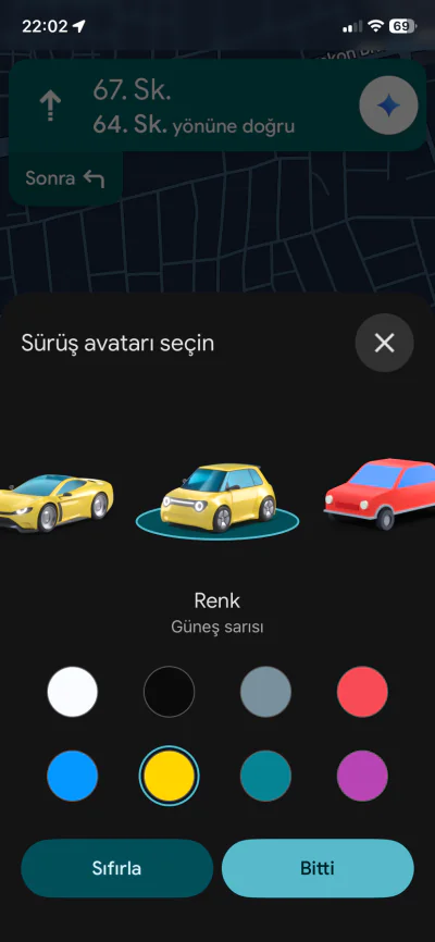 5. Açılan ekrandan yönlendiricimiz’in yani aracımızın hem modeli hem de rengini değiştire bilirsiniz.Google Haritalarda Navigasyon Yönlendirici Değiştirme