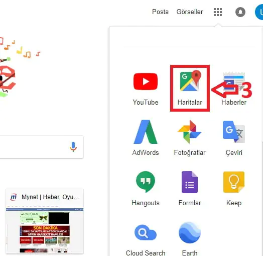 - İşlemlerimize, Google hesabımıza giriş yaparak başlıyoruz. Sonrasında ana ekranda bulunan ‘Uygulama’ menüsüne tıklıyoruz ve açılan ekrandan ‘Haritalar’ uygulamasını buluyoruz.