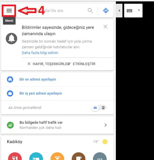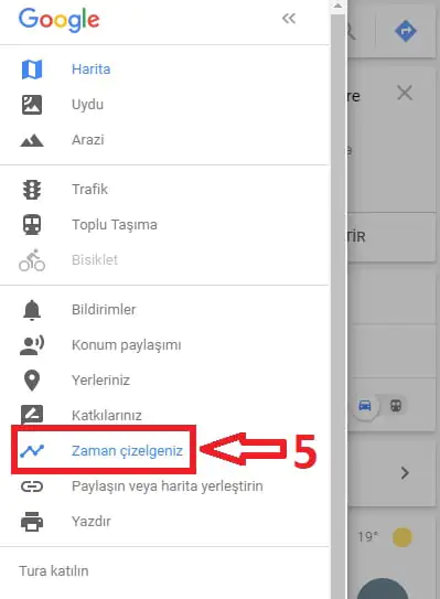 - Açılan ‘Haritalar’ uygulaması menü listesinde, ‘Zaman Çizelgesi’ menüsünü buluyoruz.