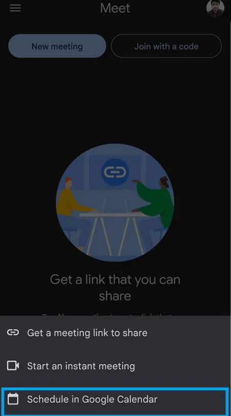 - “Yeni toplantı”ya dokunun ve “Google Takvim’de Planla”yı seçin.