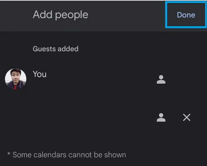 4. Katılımcı eklemek için adınızı veya e-posta adresinizi girin ve “Bitti”ye dokunun.
