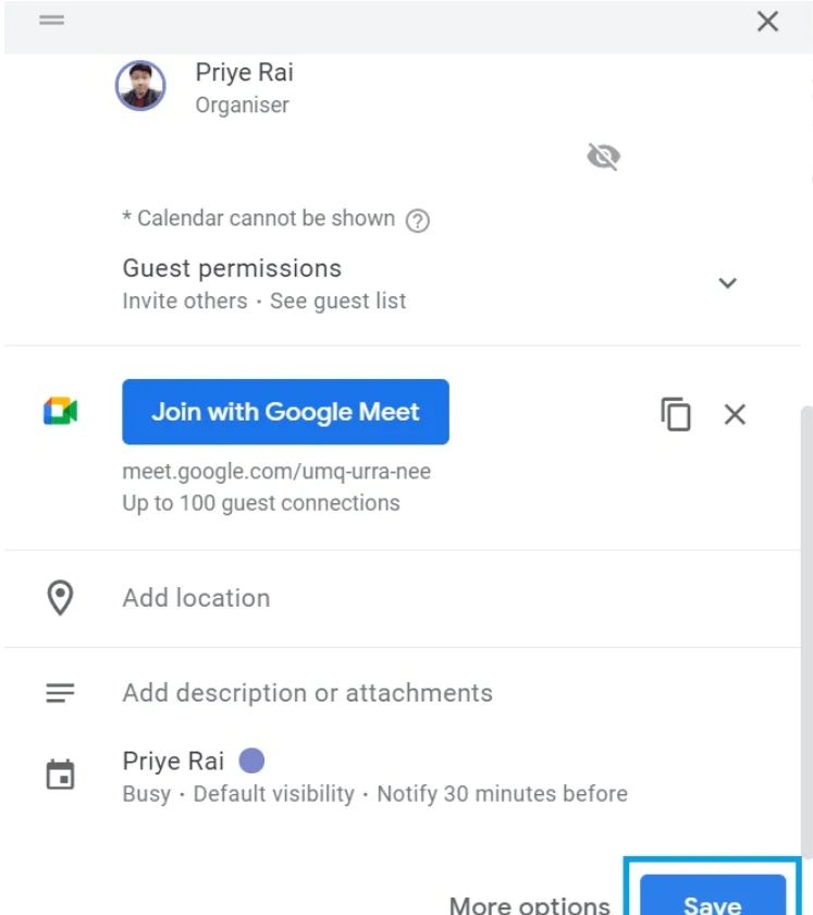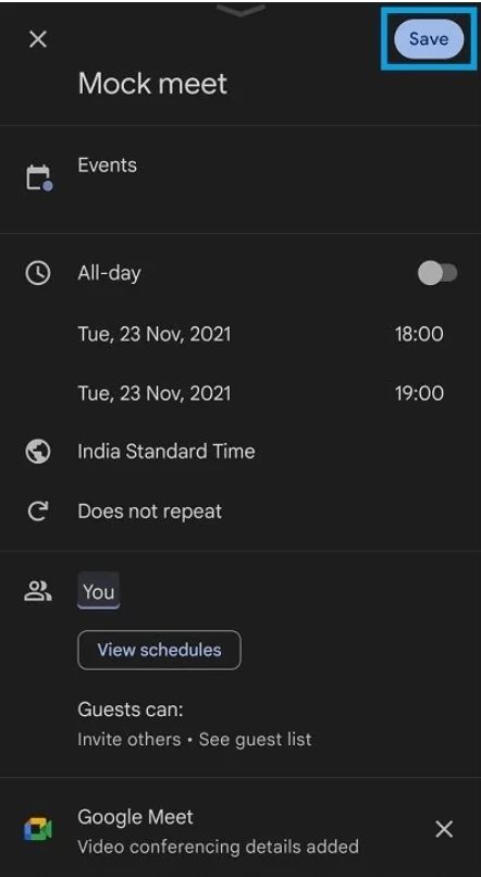 4. Toplantı ayrıntılarını girin, konukları ekleyin ve ardından “Kaydet”e tıklayın.