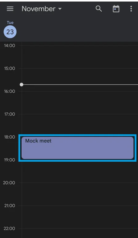 - Meet etkinliği artık Google Takvim uygulamanızda da görünmelidir. Zamanlamaları değiştirmek, başlığı düzenlemek veya oturumu silmek için etkinliğe dokunabilirsiniz.