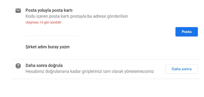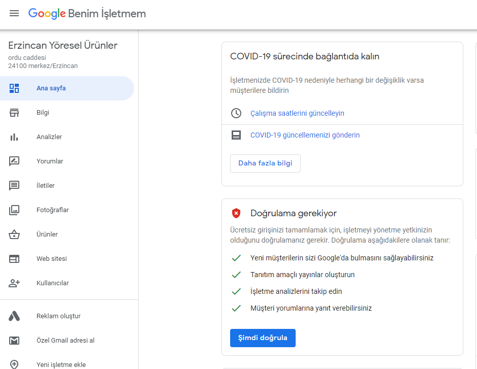 Girişinizi doğrulayarak ya da bu işlemi sonraya bırakarak işlemleri tamamlayınız. Böylece, Google My Business grafiğinizi görecek ve açılış saatlerini, kapanış saatlerinizi, fotoğrafları, logonuzu, açıklamanızı ve ürünlerinizi eklemek üzere profilinizi tamamlayabiliyorsunuz.