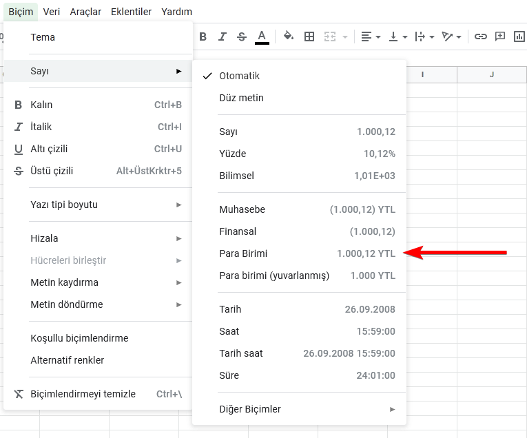 Yukarıdan “Biçim”e tıklayın ve Sayı kategorisini genişletin. “Para Birimi”nin sağında ayarlamış olduğunuz yeni para biriminizi görebiliyor olmalısınız.