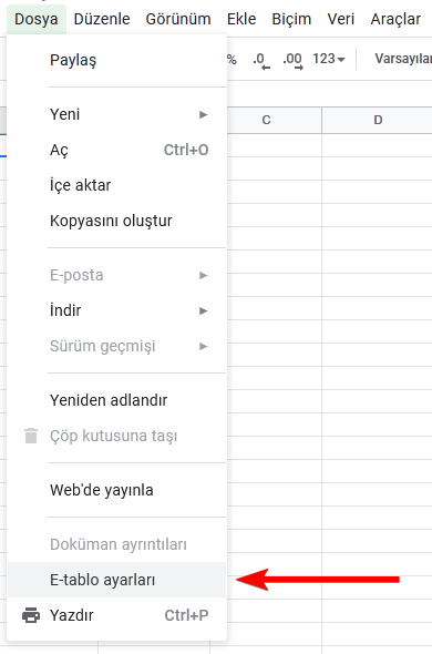 Değiştirmek istediğiniz e-tabloyu açın ve “Dosya”ya tıklayıp “E-tablo ayarları”na girin.