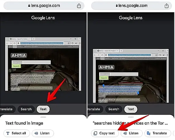 4. Resimdeki metin vurgulanacaktır. Seçilen metni kopyalamak için “Tümünü Seç” bölümünü kullanın veya metni resimden manuel olarak seçmek için metne uzun basın. Bunu “Kopyala” düğmesine dokunarak devam edin.