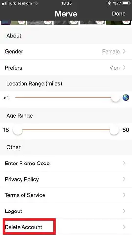 Hater hesabınızı silmek isterseniz, uygulamayı kullanma işlemi ne kadar basitse aynı şekild silme işlemi de bu kadar basit. Profil bölümüne tıkladıktan sonra ayarlara giriş işlemi sağlıyoruz gelen ekranımızda alt bölüme doğru inildiğinde delete account simgesine tıklamamız yeterli.
